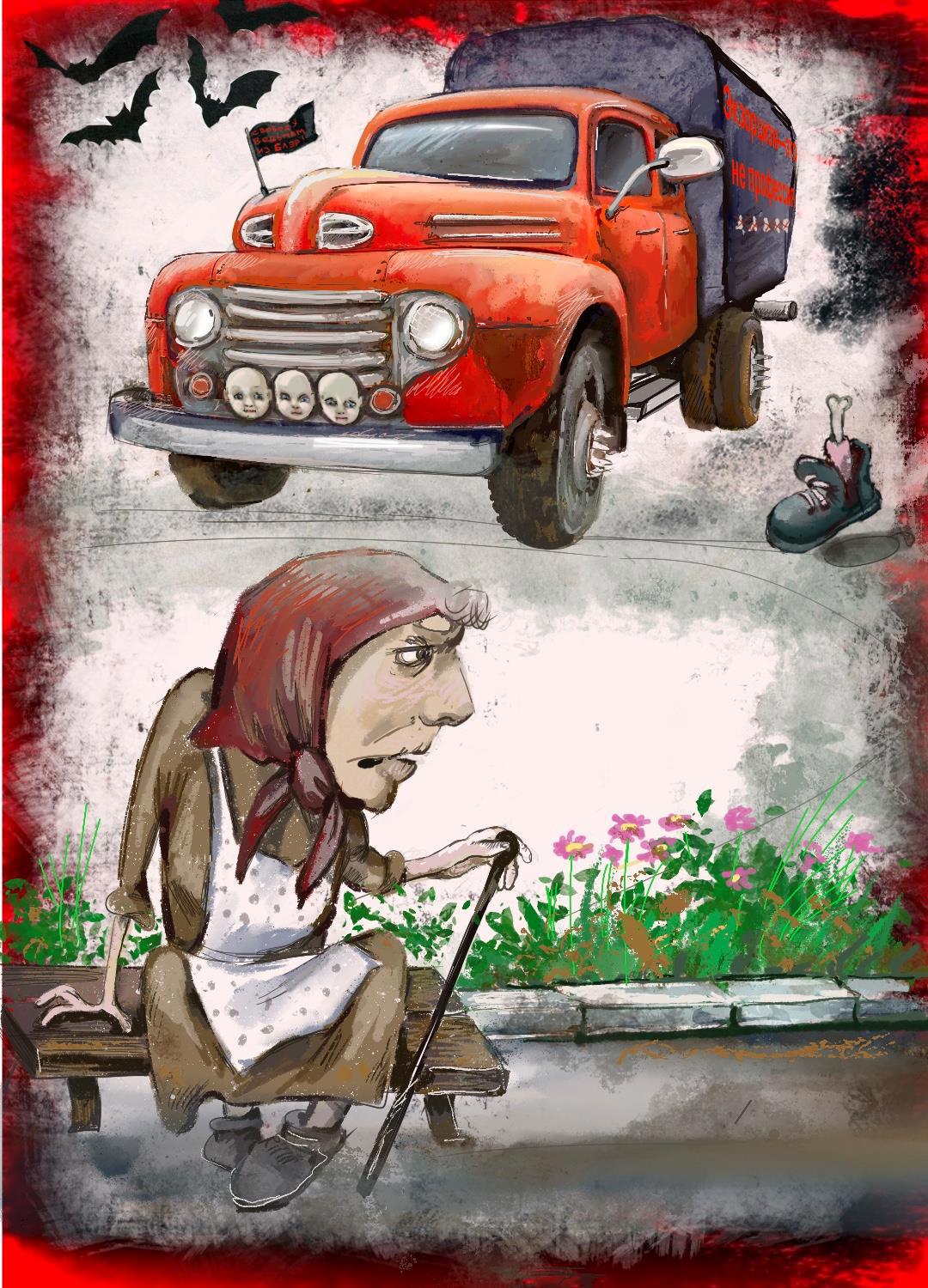 Но тут бабка заметила, как из приоткрывшейся дверцы выпал маленький красный ботиночек. Прищурилась старая. И обомлела — из него торчало нечто похожее на кость.
