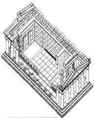 Помещения за базами статуй, возможно, выполняли те же функции, что и "сокровищницы" в Олимпии. Одно из строений на дальней оконечности ряда пьедесталов, видимо, было небольшим храмом.