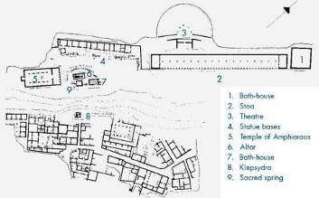 1. Баня, 2. Стоя, 3. Театр, 4. Базы статуй, 5. Храм Амфиарая, 6. Алтарь, 7. Баня, 8. Клепсидра (водяные часы), 9. Священный источник