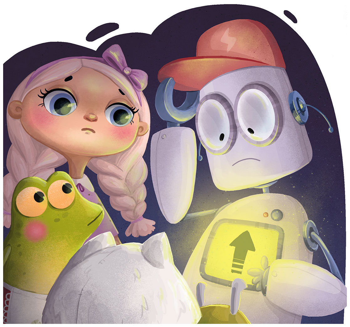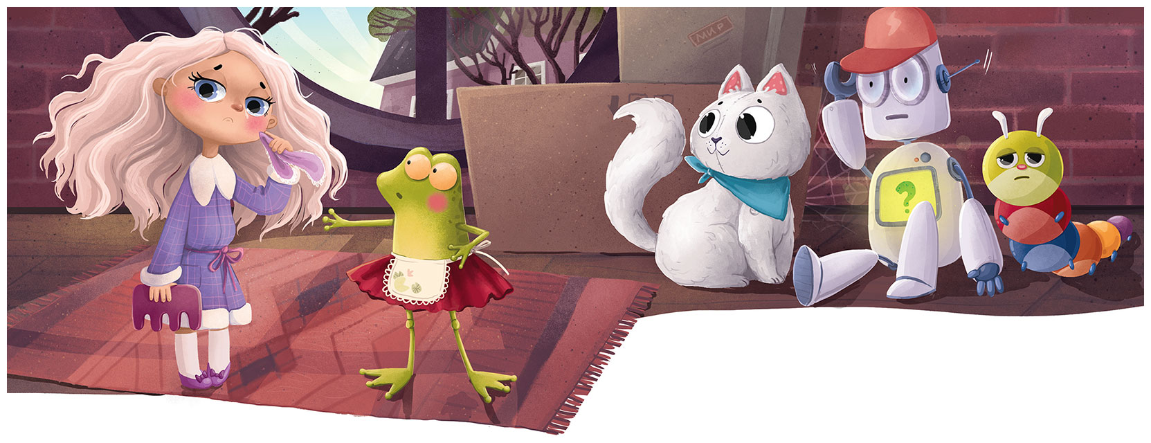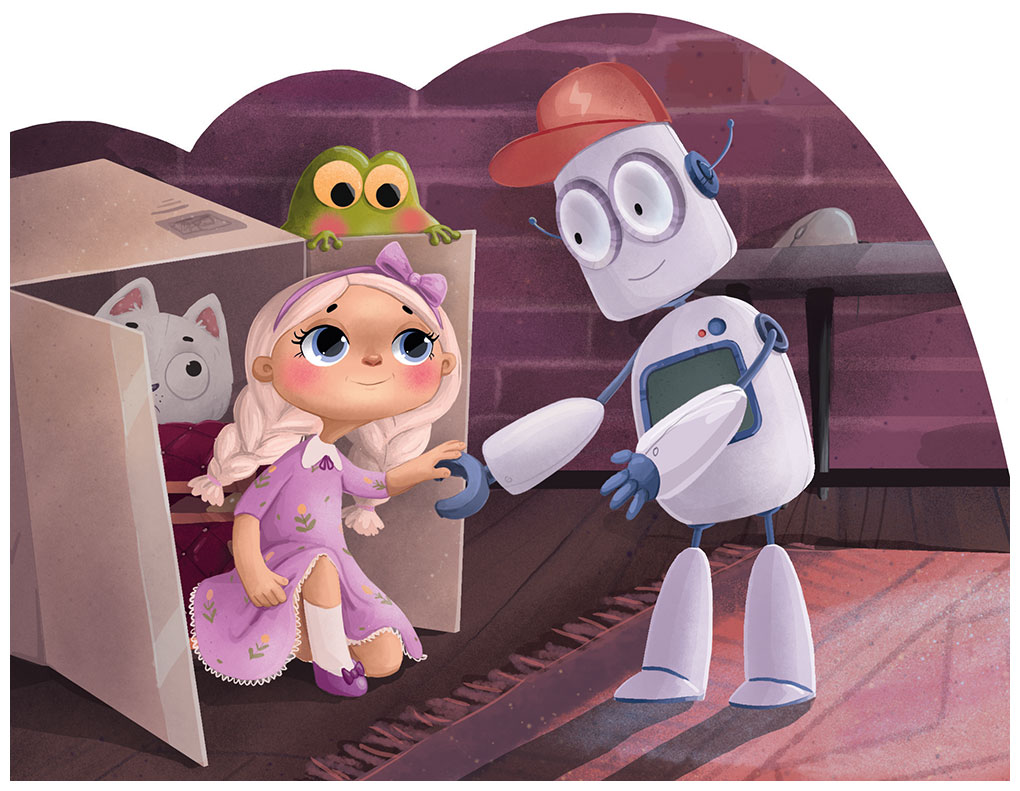 Робот Марвин шагнул из угла коробки и подал кукле Элизе руку. Потом вместе с Кефиркой они вытащили сундук с нарядами, удивлённо разглядывая незнакомую комнату.