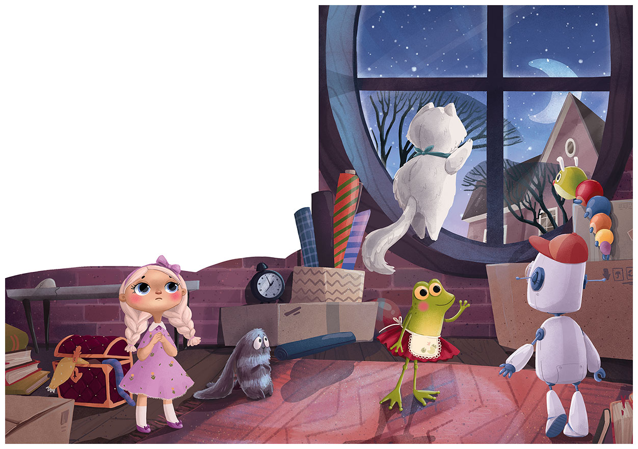 Коробку небрежно бросили на пол. Игрушки испуганно ахнули и сбились в кучу. Хлопнула дверь, и на лестнице затихли шаги. Несколько секунд стояла тишина. Первым не выдержал белый кот по имени Кефирка и недовольно замахал хвостом: