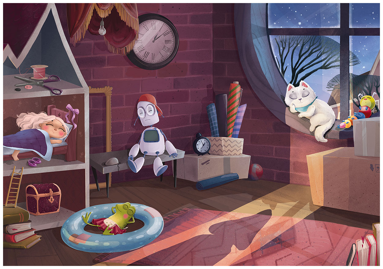 Наступила ночь. На чердаке после долгой возни наконец всё стихло. В слуховое окно заглянула сырная луна, но её никто не видел. После дневных приключений все игрушки крепко спали.
