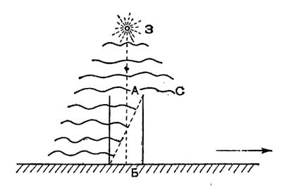 Идея, приходившая на ум, состояла, в частности, в следующем. Предположим, как показано на рисунке, что труба телескопа нацелена на звезду 3 (находящуюся — для простоты рассуждения — в зените). Пусть АБ — центральная ось трубы, а С — фронт световых волн, вступивший в верхнее ее отверстие. Если бы Земля и прилегающий к ней эфир двигались как единое целое, тогда световой фронт, попав внутрь трубы, прошел бы путь от А до Б и достиг ее основания. При движении же Земли независимо от эфира в направлении, указанном стрелкой, труба за то время, что свет будет идти от А до Б, сместится на определенный отрезок вправо, и фронт световых волн не сможет достичь основания. Чтобы обойти это препятствие, пришлось бы наклонить трубу на соответственный угол вправо (то есть по ходу движения Земли). Примерно так же поступает человек, бегущий под отвесным дождем с раскрытым над головой зонтиком. Чтобы капли дождя не попадали под зонтик, бегущий должен наклонить зонтик в направлении своего движения. Угол наклона, как нетрудно рассчитать, зависит от отношения скоростей: когда речь идет о Земле и о свете звезд, этот угол получается приблизительно 20,5 дуговой секунды в год. Но как раз такое годовое смещение и было замечено впервые в 1726 году английским астрономом Джеймсом Брадлеем для звезды Гамма в созвездии Дракона!