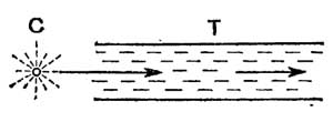 В 1851 году французский физик Ипполит Физо демонстрировал в Парижской Академии наук экспериментальную установку, которая, по его мнению, могла бы прояснить вопрос о взаимосвязи между эфиром и движением материальных тел. Вот упрощенная схема этого опыта. Световой пучок от источника света С пропускался через трубу Т, наполненную водой. Вода сначала оставалась неподвижной, а затем прогонялась вдоль по трубе в том же направлении, что и свет. Сравнивались скорости света (относительно стенок трубы) в неподвижном и в движущемся столбе воды.