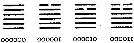 Но особенно восхищало Лейбница поразительное согласие между двоичной системой и его религиозными воззрениями. Он верил, что в основании всех явлений лежит «бытие» (или субстанции) и «небытие» (или «ничто»). Эта двойственность идеально выражалась числами 1 и 0. Подобно тому как Бог создал все бытие из пустоты, все числа можно записать в терминах единиц и нулей. К немалой радости Лейбница, его убежденность в том, что в двоичной системе выражена фундаментальная метафизическая истина, получила подтверждение, когда позднее он познакомился с древним китайским мистическим текстом «И Цзин» — «Книгой Перемен». С помощью этой книги можно заглянуть в будущее. В ней содержится 64 различных символа, каждый из которых сопровождается набором афоризмов. Гадающий случайным образом выбирает какой-то символ (традиционно — бросая веточки тысячелистника) и интерпретирует соответствующие комментарии — получается нечто вроде того, что можно прочитать в астрологическом прогнозе. Каждый символ в «Книге Перемен» представляет собой гексаграмму, то есть составлен из шести горизонтальных линий. Эти линии могут быть целыми (им соответствует ян) или иметь разрывы (им соответствует инь). Все 64 гексаграммы в «Книге Перемен» представляют собой полный набор комбинаций, составленных из инь и ян, сгруппированных по шесть.