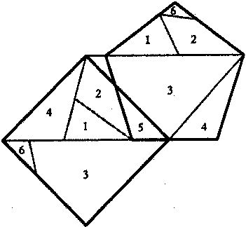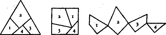 Дьюдени также открыл новый способ разбиения правильного треугольника на четыре куска, из которых собирается квадрат. Более того, он придумал, что если эти четыре куска соединить шарнирами, то их можно складывать одним способом в треугольник, а другим — в квадрат. Он назвал получившуюся конструкцию «Головоломкой галантерейщика», потому что формы фигур выглядели как обрезки материи в лавке галантерейщика. Эта головоломка ввела в обиход идею «шарнирного разбиения» и вызвала такой интерес, что Дьюдени изготовил ее из красного дерева с медными шарнирами и в 1905 году выступил с докладом об этой задаче на заседании Королевского математического общества в Лондоне. «Головоломка галантерейщика», жемчужина наследия Дьюдени, до сих пор вызывает восторг математиков.