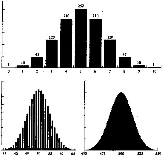 Форма кривой становится все более знакомой по мере увеличения числа рядов из штырей. На рисунке приведены также диаграммы, получающиеся для 100 и 1000 рядов. (Для двух последних диаграмм показаны только их центральные области, поскольку значения в областях, уходящих налево и направо, слишком малы, чтобы их можно было изобразить.)