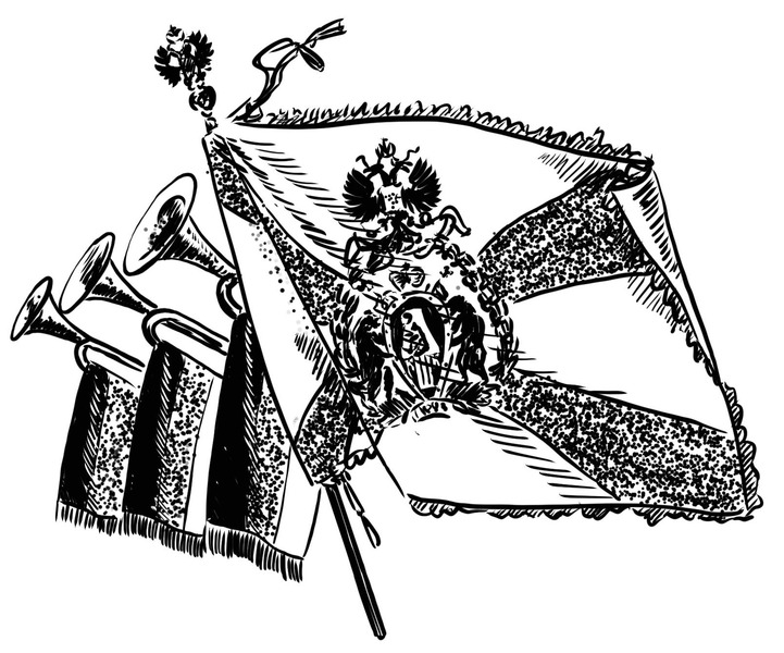 Ух, как они шли, отделение за отделением, по четверо в ряд, в белых перчатках, с аксельбантами (серебристые у всех, кроме выпускного класса — у техх золотые), «на руку» взяты короткие карабины, и знамя корпуса плывёт под звуки марша — алый косой крест на белом фоне, а в середине — золотой герб александровцев под чернокрылым двуглавым орлом.