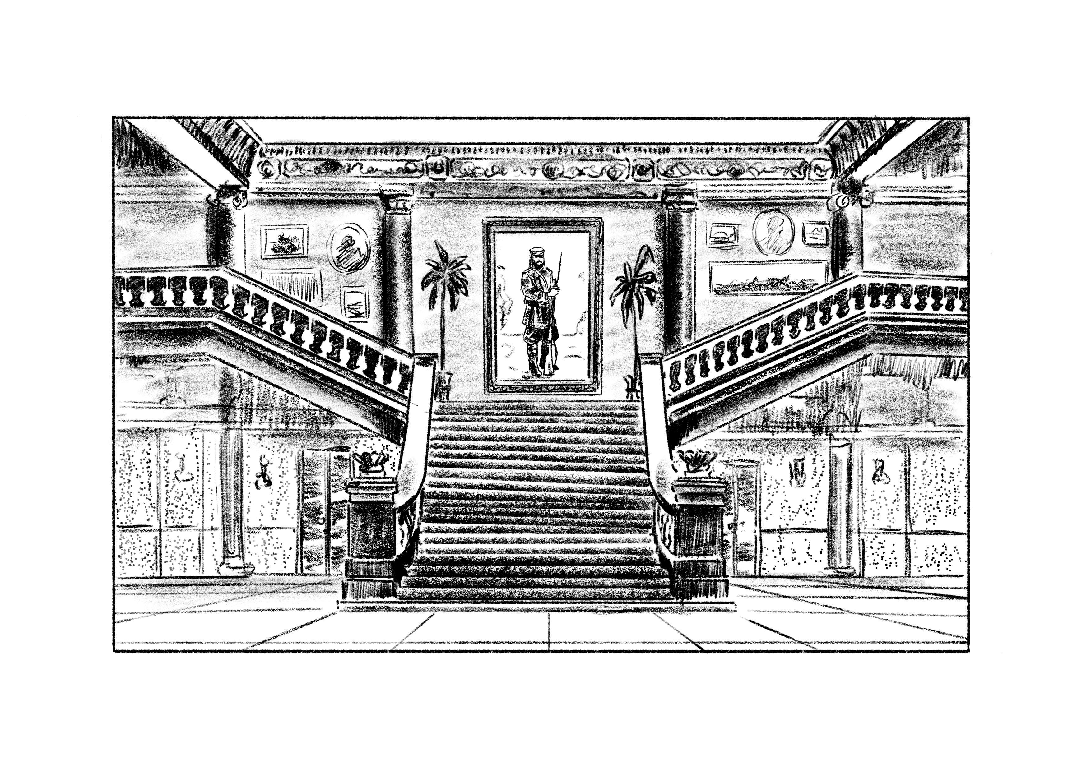 Прямо перед кадетами начиналась широкая мраморная лестница, самому Зимнему дворцу впору; она достигала протяжённой площадки первого этажа, разделяясь на два ведущих ещё выше марша, вправо и влево, к широким балконам второго яруса.