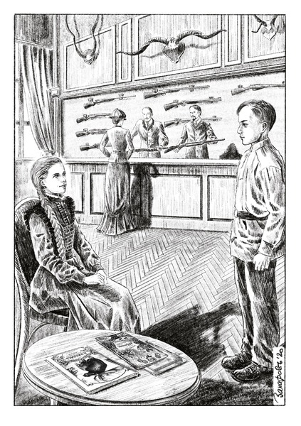 Приказчик Евграф и хозяин Феофил Феофилыч склоняли Варвару Аполлоновну к приобретению «американской автоматической дробовой магазинки Браунинга» аж за семьдесят пять рублей («и шестьдесят копеек за добавление антабок к оному») или же «шестизарядного магазинного дробовика Винчестера с подвижным цевьём отличной работы» за всего лишь шестьдесят целковых. Варвара Аполлоновна колебалась; гимназистка Елизавета сидела с очень прямой спиной, разве только