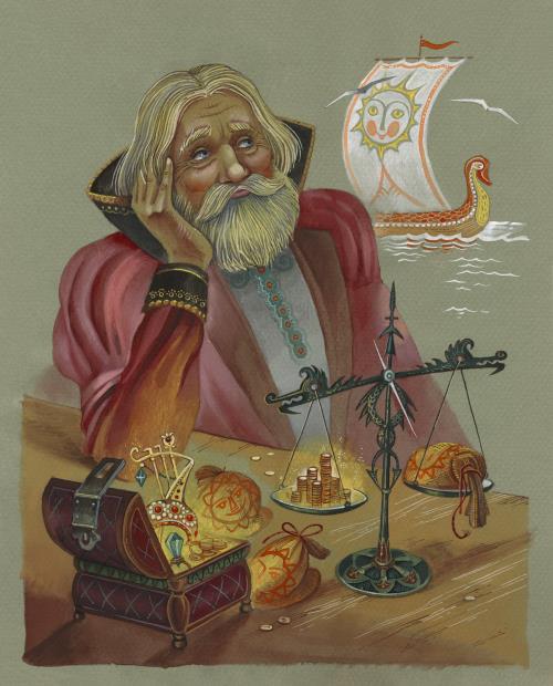 Вот и собирается тот купец по своим торговым делам за море, за тридевять земель, в тридевятое царство, в тридесятое государство, и говорит он своим любезным дочерям: