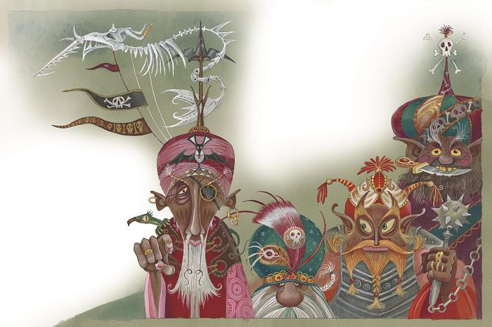 У честного купца от страха зуб на зуб не приходил; он оглянулся кругом и видит, что со всех сторон, из-под каждого дерева и кустика, из-под воды, из-под земли лезет к нему сила нечистая и несметная, всё страшилища безобразные. Он упал на колени перед набольшим хозяином, чудищем мохнатым, и возговорил голосом жалобным: