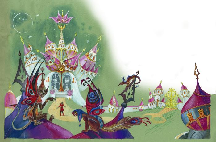 Сходит он по другой лестнице из мрамора зелёного, из малахита медного, с перилами позолоченными, сходит прямо в зелены сады. Гуляет он и любуется: на деревьях висят плоды спелые, румяные, сами в рот так и просятся, глядя на них, слюнки текут; цветы цветут распрекрасные, махровые, пахучие, всякими красками расписанные; птицы летают невиданные, словно по бархату зелёному и пунцовому золотом и серебром выложенные, песни поют райские; фонтаны воды бьют высокие, глядеть на их вышину – голова запрокидывается; и бегут и шумят ключи родниковые по колодам хрустальным.