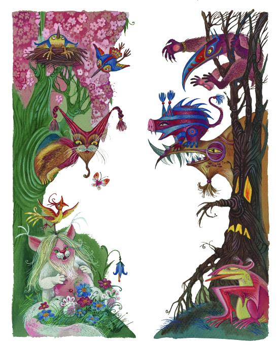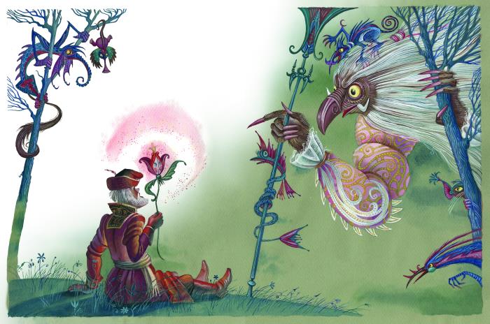 – Благослови меня, государь мой батюшка родимый: я поеду к зверю лесному, чуду морскому, и стану жить у него. Для меня достал ты аленький цветочек, и мне надо выручить тебя.