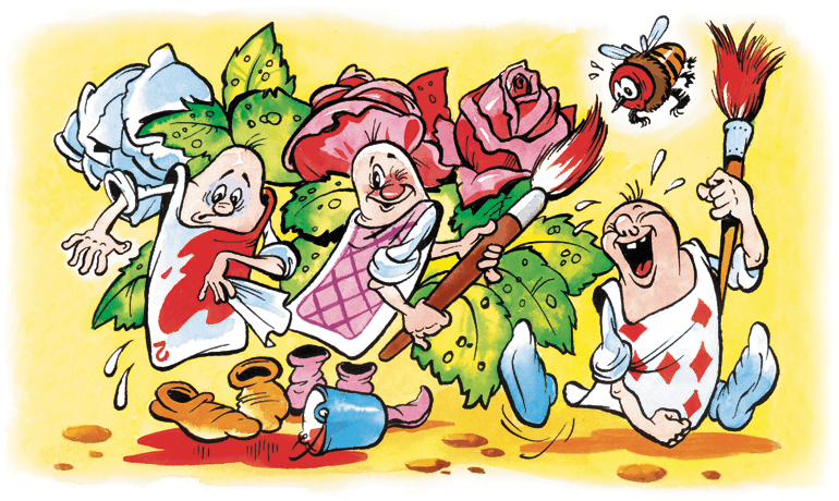 – Вот ведь какое дело, велено было нам красные розы посадить. Ан, глядь, выросли белые! Мы их и перекрашиваем, пока Королева не дозналась. Не то не сносить нам головы.