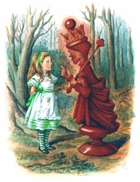 — Здесь играют в шахматы! Весь этот мир — шахматы (если только, конечно, это можно назвать миром)! Это одна большая-пребольшая партия. Ой, как интересно! И как бы мне хотелось, чтобы меня приняли в эту игру! Я даже согласна быть Пешкой, только бы меня взяли… Хотя, конечно, больше всего мне бы хотелось быть Королевой!