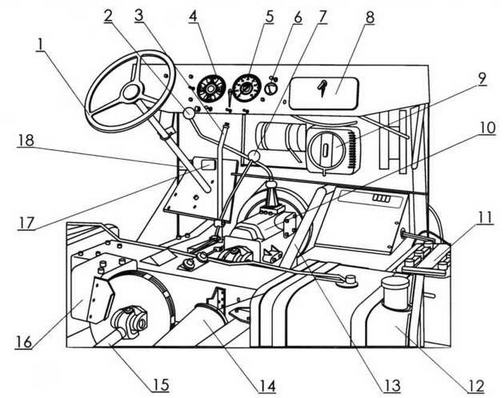 1 — руль; 2 — кулиса; 3 — ручной тормоз; 4 — комбинация приборов (амперметр, указатели уровня топлива, давления масла и температуры охлаждающей жидкости); 5 — спидометр; 6 — вольтметр; 7 — рычаг раздаточной коробки; 8 — перчаточный ящик; 9 — обогреватель; 10 — коробка передач; 11 — аккумулятор; 12 — правый топливный бак; 13 — выхлопная труба; 14 — глушитель; 15 — карданный вал; 16 — механизм ручного тормоза; 17 — педаль тормоза; 18 — педаль сцепления