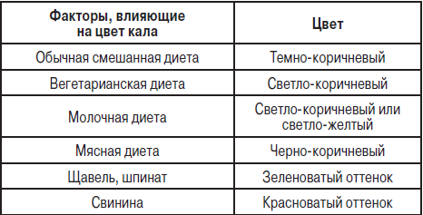 Коричневатый цвет кала обусловлен присутствием в испражнениях стеркобилина– одного из конечных продуктов билирубинового обмена. Кроме того, на окраску кала оказывают влияние характер питания и прием некоторых лекарственных препаратов.