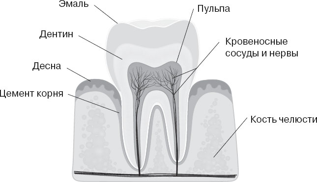 Любой зуб, независимо от своего вида, состоит из трех частей — корня, шейки и коронки. Коронка — это видимая часть зуба, которая выступает над десной. Она покрыта зубной эмалью, самой твердой тканью человеческого организма, которая на 97 % состоит из неорганических компонентов — минеральных солей. Под эмалью находится дентин, ткань, из которой состоит зуб. По своему строению дентин похож на костную ткань, но он прочнее, благодаря более высокому содержанию минеральных солей. В области корня дентин особой тканью, которую называют «цементом» (не путайте со строительным цементом!). покрытие, которое в свою очередь