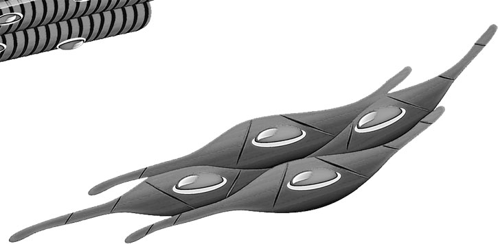 Гладкая мышечная ткань состоит из одноядерных клеток веретенообразной формы длиной от 15 до 500 мкм. В световом микроскопе цитоплазма этих клеток выглядит однородно, без поперечной исчерченности, присущей поперечно-полосатой мышечной ткани. Гладкая мышечная ткань медленно сокращается и расслабляется и ее деятельность является непроизвольной, то есть не управляется по нашей воле. Гладкая мышечная ткань входит в состав стенок пищеварительного тракта, кровеносных и лимфатических сосудов, мочевыводящих и дыхательных путей.