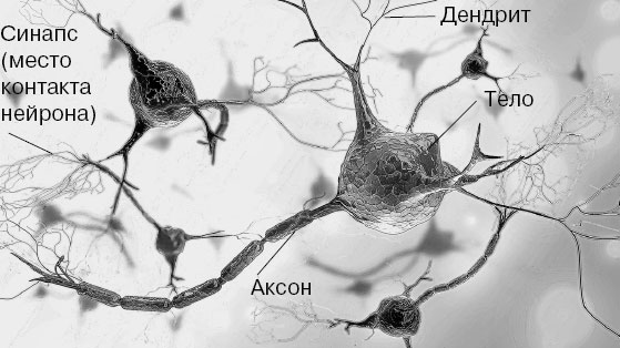 Среди отростков различают дендриты, которые воспринимают сигналы от других нейронов, рецепторных клеток или от внешних раздражителей, и аксоны, передающие нервные сигналы от тела нейрона к другим нервным клеткам или непосредственно к органам. Если дендритов у нейрона может быть много, то аксон всегда только один. Место контакта аксона с другими клетками называют «синапсом». Механизм передачи нервного импульса может быть химическим, электрическим или смешанным. При химическом механизме клетка, являющаяся источником импульса, выпускает в межклеточное пространство особое вещество, называемое «нейромедиатором», которое возбуждает или затормаживает клетку, получающую импульс. При электрическом механизме из клетки в клетку переходят ионы. При смешанном механизме нейромедиатор усиливает «ионную» передачу импульса.
