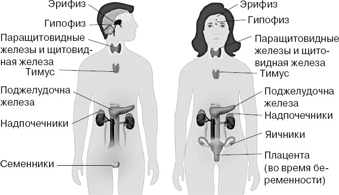 Эндокринная система состоит из желез внутренней секреции, к которым относятся щитовидная железа, околощитовидные железы, вилочковая железа (тимус), гипофиз, гипоталамус, эпифиз, поджелудочная железа, надпочечники, параганглии и половые железы — семенники у мужчин и яичники у женщин. Каждая железа вырабатывает и выделяет в кровь особые химические вещества, участвующие в регуляции определенных функций организма.