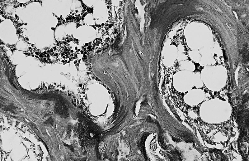 Обратите внимание на большое количество длинных отростков у остеоцитов. С их помощью клетки, расположенные далеко друг от друга, контактируют между собой.
