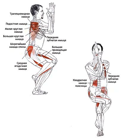 Чтобы переплести конечности, надо согнуть опорную ногу в тазобедренном и коленном суставах. Положение, при котором тазобедренный сустав сгибается с одновременным поворотом внутрь и приведением ноги, достаточно сложное (волокна суставной капсулы легче позволяют повернуть бедро внутрь, когда сустав разогнут). Приведение ноги в сочетании с поворотом внутрь ставит сложные задачи перед грушевидной мышцей. Эта поза может также создать чрезмерную нагрузку на колени. Если мышцы бедер чрезмерно напряжены, то колени вынуждены слишком сильно поворачиваться внутрь. Поза орла укрепляет крестцово-подвздошный сустав.