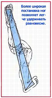 Ноги, стоящие на слишком большом расстоянии друг от друга, создают большую нагрузку на область таза, задействуют отводящие мышцы бедра для удержания равновесия, но при этом центр тяжести перемещается вниз, за счет чего сохранять положение становится несколько легче.
