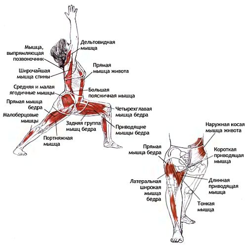 Те же, что и в позе воина 1, но с более глубоким разгибанием позвоночника в поясничном отделе по отношению к тазу;