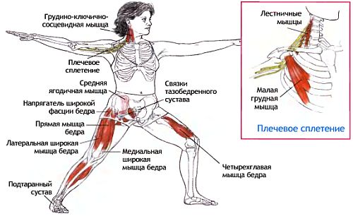 — закрепощение или ослабление мышц, отводящих и вращающих ногу в тазобедренном суставе (при продолжительном пребывании в асане на них приходится большая нагрузка).