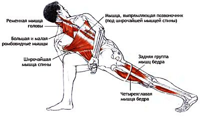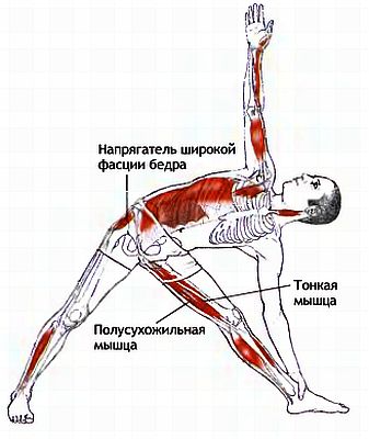 Боль в задней части колена или бедра может возникать из-за напряжения в верхней части подвздошно-большеберцового тракта (напрягателе широкой фасции бедра, средней или большой ягодичных мышцах, которые активно работают и растягиваются). Если напряжение возникает в большой или средней ягодичных мышцах, а нога не отведена в достаточной степени, то позвоночник изгибается в сторону. Напряжение в верхней части подвздошно-большеберцового тракта может, кроме тою, стать причиной чрезмерной нагрузки на заднюю часть голеностопного сустава.