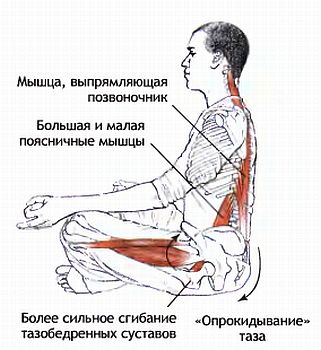В любой позе сидя, если коленные суставы находятся выше уровня тазобедренных, таз имеет тенденцию «опрокидываться» назад, заставляя позвоночник сгибаться, особенно если закрепощена задняя группа мышц бедра. Чтобы придать телу прямое положение, сокращаются мышцы, выпрямляющие позвоночник, а также большая и малая поясничные мышцы (пытающиеся восстановить его поясничный изгиб). К сожалению, это действие поясничных мышц одновременно еще сильнее сгибает ноги в тазобедренных суставах, увеличивая смещение таза назад и вниз, в результате чего задействуются дополнительные мышцы, пытающиеся компенсировать данное движение. Если вы ввязались в эту безнадежную борьбу с силой тяжести, то у вас останется слишком мало энергии для дыхания и медитации и быстро наступит утомление.