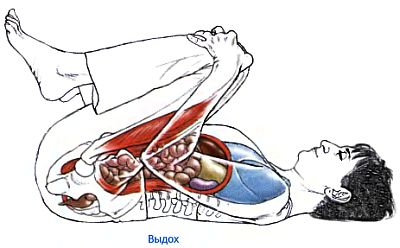 Прижимание коленей к туловищу на выдохе стимулирует расслабление диафрагмы. Традиционно это упражнение выполняется только за счет использования мышц живота и мышц, сгибающих тазобедренные суставы. Руки спокойно лежат на коленях, не принимая активного участия.