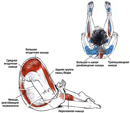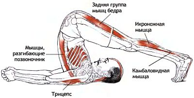 — работают те же мышцы спины, что и в сарвангасане, но более интенсивно, поскольку им приходится удерживать вес ног;