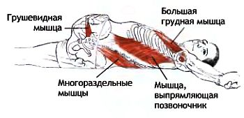 — мышцы живота (эксцентрическое действие, направленное на противодействие смещению вперед внутренних органов, вызванному сокращением большой и малой поясничных мышц);