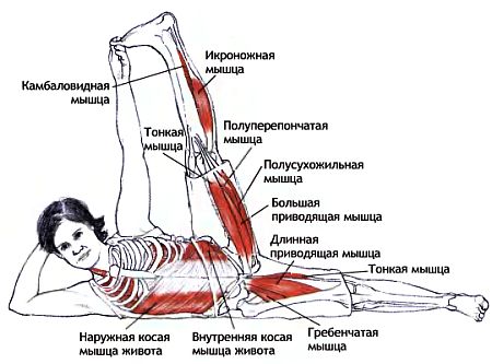 В этой позе задняя группа мышц бедра используется для разгибания тазобедренных суставов и сгибания коленных суставов. При таком положении ног эти мышцы сокращаются до минимальной длины, что может вызвать в них судороги.