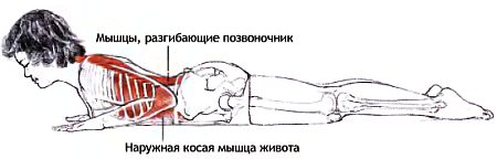 — верхняя задняя зубчатая мышца (расширяет грудную клетку, способствуя разгибанию позвоночника). Прямая мышца живота, наружная и внутренняя косые мышцы живота действуют эксцентрически, не допуская чрезмерного разгибания поясничного отдела.