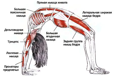 Наиболее сильной растяжке подвергаются прямая мышца бедра и мышцы передней части тела. Широкие мышцы бедра растягиваются по мере сгибания ноги в колене, а большая и малая грудные мышцы по мере расширения грудной клетки и сведения лопаток.