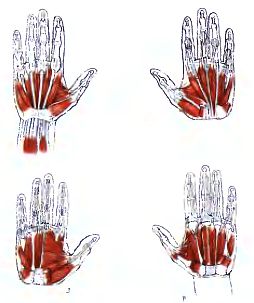 Мышцы кисти соответствуют мышцам стопы (см. с. 51).