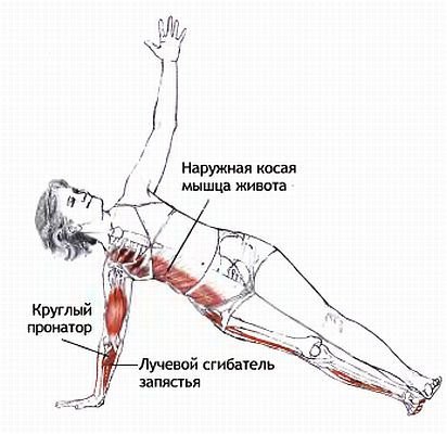 Сила тяжести самыми разными способами старается нарушить эту позу — за счет вращения позвоночника, отклонения таза или плеч. При сведении нижней лопатки и одновременном приведении нижней ноги таз стремится приблизиться к земле. Обычно этому стараются противодействовать, слишком высоко поднимая таз или прибегая к боковому сгибанию позвоночника в ту или другую сторону.