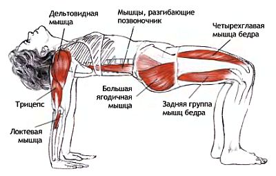 Это одна из немногих асан йоги, где активную концентрическую работу выполняют большая и малая ромбовидные мышцы, которые наряду со средним пучком трапециевидной мышцы сводят лопатки. Мышца, поднимающая лопатку, действует в соответствии со своим названием. Большая круглая мышца, трицепс, задний пучок дельтовидной мышцы и широчайшая мышца спины разгибают плечевой сустав и поднимают лопатку. Трицепс разгибает локтевой сустав, а пронаторы предплечья прижимают ладони к полу.