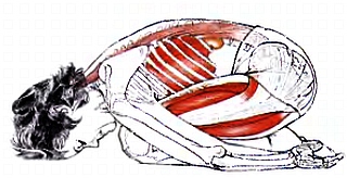 Позвоночник, опирающийся на руки и ноги, может свободно сгибаться и разгибаться в любом направлении. Хотя ученикам, осваивающим это движение, обычно говорят, что надо делать выдох при разгибании позвоночника и вдох при сгибании, более корректно было бы говорить, что сгибание позвоночника — это и есть выдох, а разгибание, соответственно, вдох. Как видно из самого определения дыхания, изменение формы позвоночника синонимично изменению формы полостей тела (см. рис. 1.6).