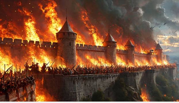Мы не стали задерживаться и, не сговариваясь, продолжили путь. С каждым пройденным метром грохот сражения становился сильнее. Пару раз я успевал увидеть через небольшие отверстия бойниц охваченную огнём округу.