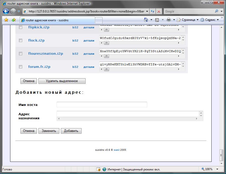 Под последней записью вы найдете форму добавления нового адреса (рис. 3.15). Введите имя сайта, например name.i2p, и его Base-64 адрес. Адрес сайта можно найти или на любых других I2P-сайтах, или в Интернете (с помощью Google). С некоторыми полезными ресурсами вы можете познакомиться на следующей страничке: http://korot97.blogspot.com/2011/06/i2p.html.