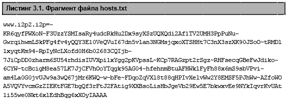 Понимаю, что перепечатывать весь этот код из книги сложно, поэтому вы можете скачать мою версию файла hosts.txt, где уже добавлен фрагмент из листинга 3.1, по следующему адресу: http://www.dkws.org.ua/i2p/hosts.txt.