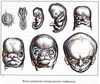 В 1866 г. соратник Дарвина Э. Геккель в сформулированном им биогенетическом законе предложил рассматривать стадии формирования человеческого зародыша как соответствующие разным видам животных: микроорганизму, рыбе, амфибии, ящерице, обезьяне… и, наконец, человеку. Геккель утверждал, что индивидуальное развитие организма представляет собой краткое и быстрое повторение исторического развития (онтогенез повторяет филогенез), всей его «родословной», начиная от первоорганизма. Этим Геккель сделал попытку объяснить непонятный во многом и для современной биологии процесс развития особи из оплодотворенной яйцеклетки (зиготы) непонятной и недоказуемой до сего дня теорией — дарвиновской теорией эволюции. Можно долго с негодованием говорить о том, что Геккель подделал снимки эмбрионов человека, использовав одно типографское клише для эмбриона черепахи и для эмбриона человека, выдав, таким образом, желаемое за действительное, за что его справедливо осудил суд ученых в Мюнхене. Но дело даже не в этом. Основное заблуждение Геккеля состояло в том, что тех животных, которых Геккель разглядел в человеческой утробе, там просто нет и быть не может.
