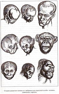 Мысль о том, что человек похож на детеныша, а не на взрослую обезьяну, высказывали давно. Так считал французский натуралист Сент-Илер еще в 1836 г. Той зрелости скелета, которую имеет новорожденная макака, человек достигает только к трем годам. Он рождается на свет недоразвитым, и его мозг продолжает расти. Если у новорожденного вес головного мозга составляет 23 % от веса тела, то полностью сформированный, набравший свои положенные кило триста, мозг появляется у человека лишь лет в двенадцать-пятнадцать. У новорожденного шимпанзе размер мозга составляет 40 % от того, каким он должен стать у взрослого животного, у новорожденной макаки уже 65 %, а у некоторых примитивных приматов мозг после рождения и не развивается вовсе. Основываясь на этих весьма интересных данных, Л. Больк в 20-е гг. XX столетия предположил, что человек есть недоразвитая обезьяна. В биологии это называется фетализацией, или неотенией, когда особь, не достигая своей взрослой стадии, получает возможность размножаться и оставлять потомков, таких же недоразвитых, как она.