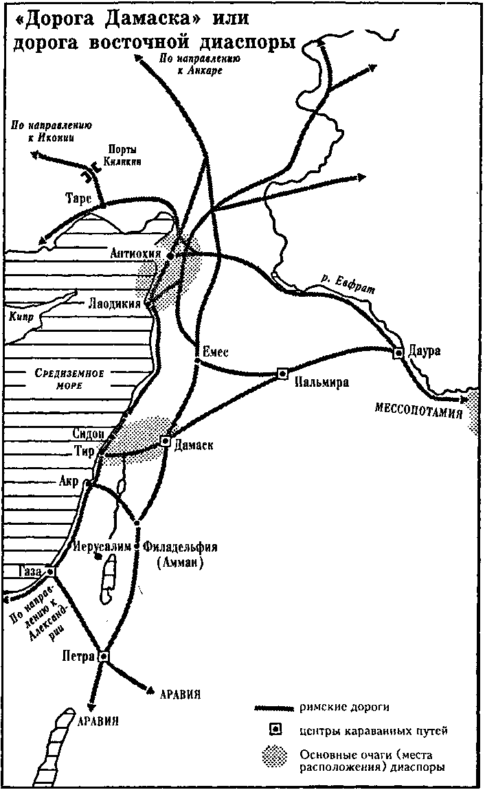 Этот огромный оазис сирийской пустыни, караванный центр, соединяющий Палмир и финикийский горный проход, славился своей ткацкой промышленностью и как место отдыха при перевозках из Иудеи. Самаритяне обосновались здесь с десятого века, в эпоху, когда Дамаск стал в Библии символизировать языческий город. Об участии иудеев в римскую эпоху смотри Б. Лившиц. «Донаторы [1185]и основатели в иудейских синагогах». Париж, 1967, № 61 и RB, 75, 1968, 377.