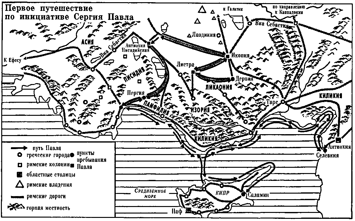 Есть данные только об одном правителе по имени Сергий Павел и его семье в Риме и Малой Азии; но даже на Кипре нет никакого документа, подтверждающего на тот момент его проконсульство. Несмотря ни на что, историческая достоверность этой личности подтверждена, и он не мог занимать должности на Кипре до июля 44 года. Служба его длилась один год [461] . Нужно отнести прибытие Павла в Паф на лето 44 года, чтобы можно было определить время первых двух апостольских путешествий до собрания в Иерусалиме в 51 году. Обратил Павел правителя, чья внучка, как считают некоторые была среди христиан в Риме, или нет, но именно от него он получил решительный толчок в своей будущей миссии.